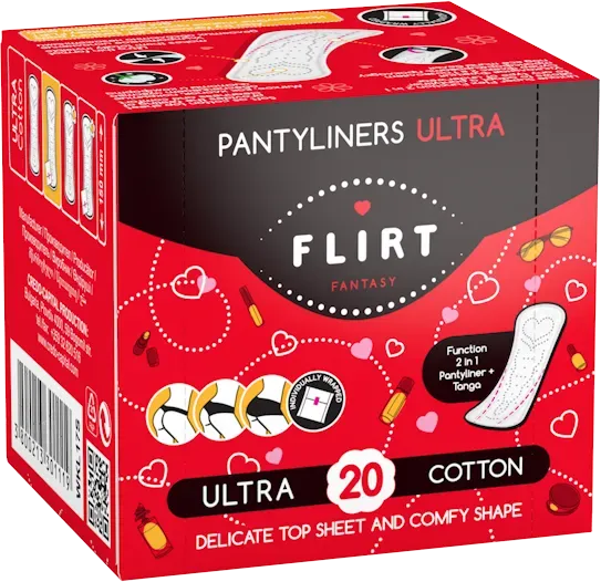 Absorbantele zilnice fantasy FLIRT Ultra Line sunt realizate într-un format ultra-subțire, ceea ce le face deosebit de flexibile și confortabile de utilizat și le face complet invizibile sub haine.