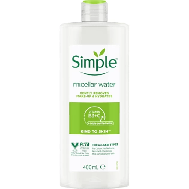 - Simple Micellar Cleansing Water Instantly Hydrates And Gently Removal Make-Up 400ml este realizată cu ingrediente care iubesc pielea, perfecte pentru toate tipurile de piele, inclusiv vitamina B3, vitamina C și apă triplu purificată.