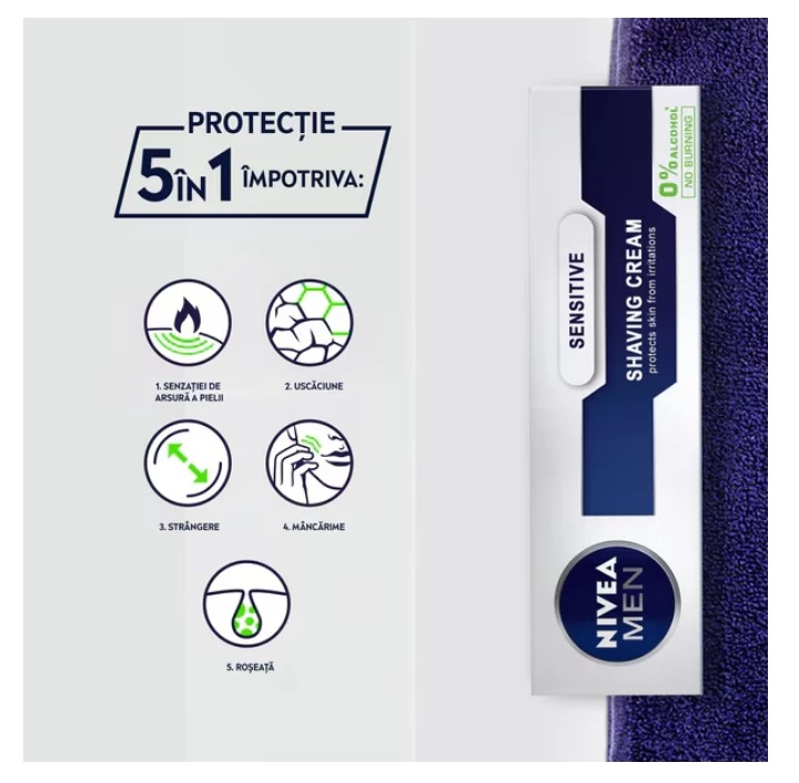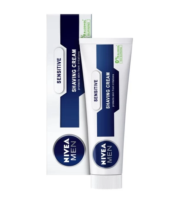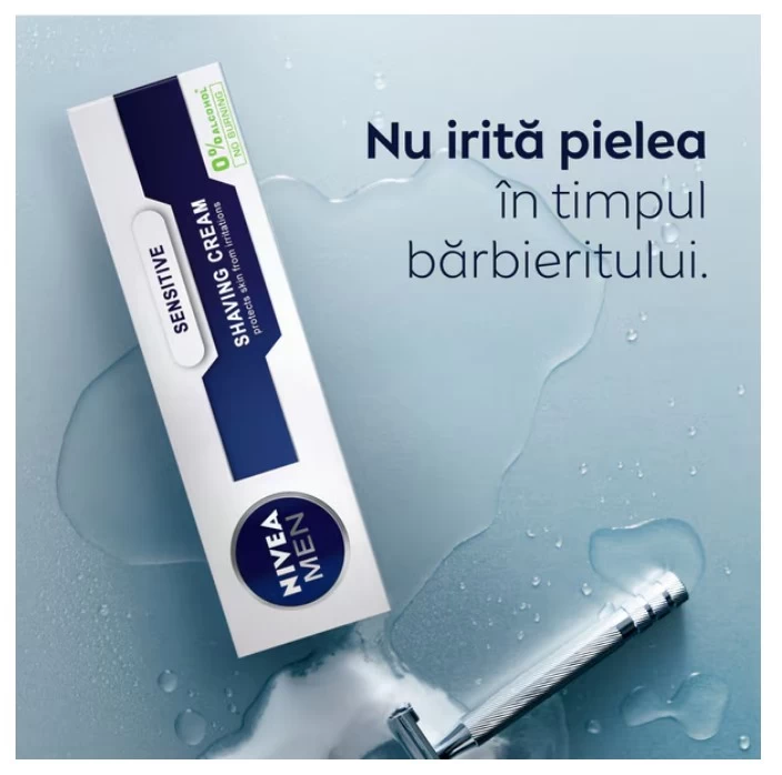 Crema de ras Nivea Men Sensitive protejeaza pielea de iritatii si ii ofera hidratare in timpul barbieritului. Contine 0% alcool si nu lasa senzatie de arsura. Formula eficienta are un parfum masculin neutru. Datorita extractului de musetel si hamamelis asigura ingrijire optima, oferind un barbierit neted si confortabil, lasand pielea cu un aspect mai sanatos. Produsul este aprobat dermatologic pentru barbatii cu piele sensibila.