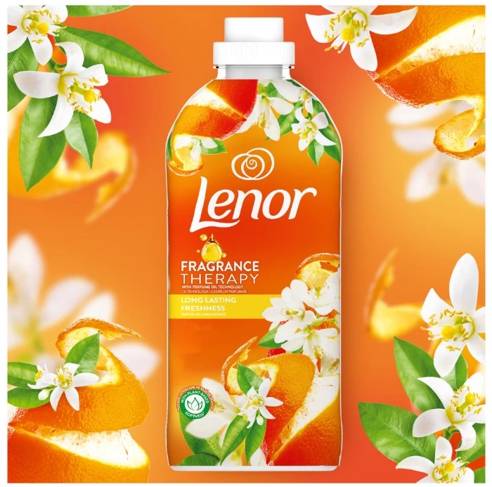 Balsamul de rufe Lenor Orange & Verbena cu note fresh de citrice, floare de verbina si mango are un parfum care dureaza de 3 ori mai mult*.