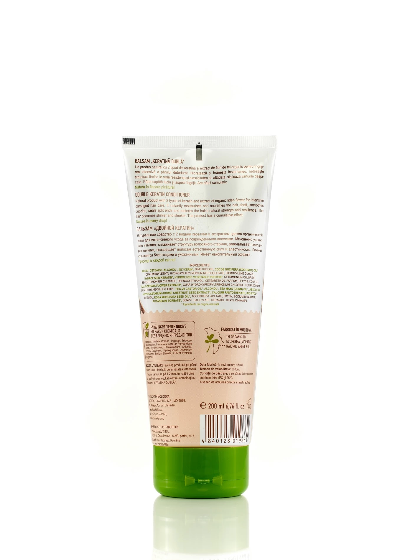 Un produs natural cu 2 tipuri de keratină și extract de flori de tei organic pentru îngrijirea intensivă a părului deteriorat. Hidratează și hrănește instantaneu, netezește structura firelor, le redă rezis - tența și elasticitatea de altădată, sigilează vârfurile despicate. Părul capătă luciu și aspect îngrijit. Are efect cumulativ.