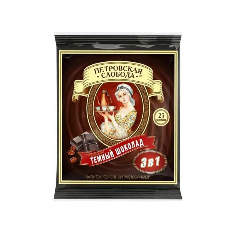 Băutură instant de cafea Petrovskaya Sloboda 3 în 1 Ciocolată neagră: cafea, smântână, zahăr.