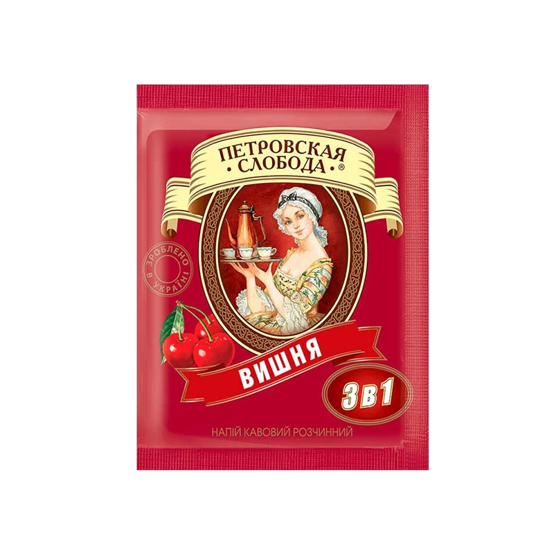 „Petrovskaya Sloboda 3 în 1 Cireșe” este o băutură pe bază de cafea, care combină gustul intens al cafelei solubile, al smântânii și al aromelor delicate de cireșe. Această băutură este o alegere excelentă pentru iubitorii de combinații gustative neobișnuite. Aroma sa ușoară de fructe conferă fiecărei înghițituri un gust deosebit. Ambalajul conține 25 de porții, ceea ce asigură ușurința utilizării și păstrarea prospețimii băuturii. Compoziție: cafea solubilă, zahăr, smântână uscată, aromă de cireșe.