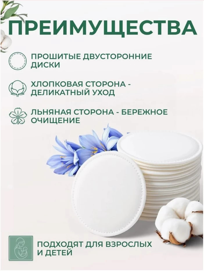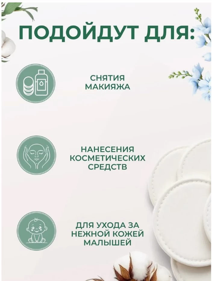 Acestea sunt fabricate din materiale naturale și, prin urmare, au proprietăți absorbante bune. Suprafața produsului este moale și plăcută la atingere. Tampoanele din bumbac nu se despică în timpul utilizării datorită marginilor cusute și nu lasă scame. Atunci când se demachiază, nu se întinde machiajul pe față, ci îl absorb bine.