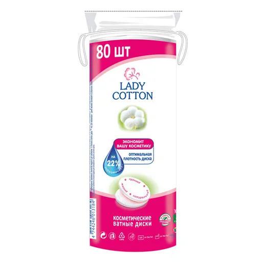 Tampoanele de bumbac pentru cosmetice Lady Cotton, realizate din bumbac 100%, sunt foarte moi, durabile și asigură o utilizare rațională a produselor cosmetice pentru femei în fiecare zi. O economie de 22% în consumul de produse cosmetice este asigurată de densitatea unică a discului și a fost testată în laborator.