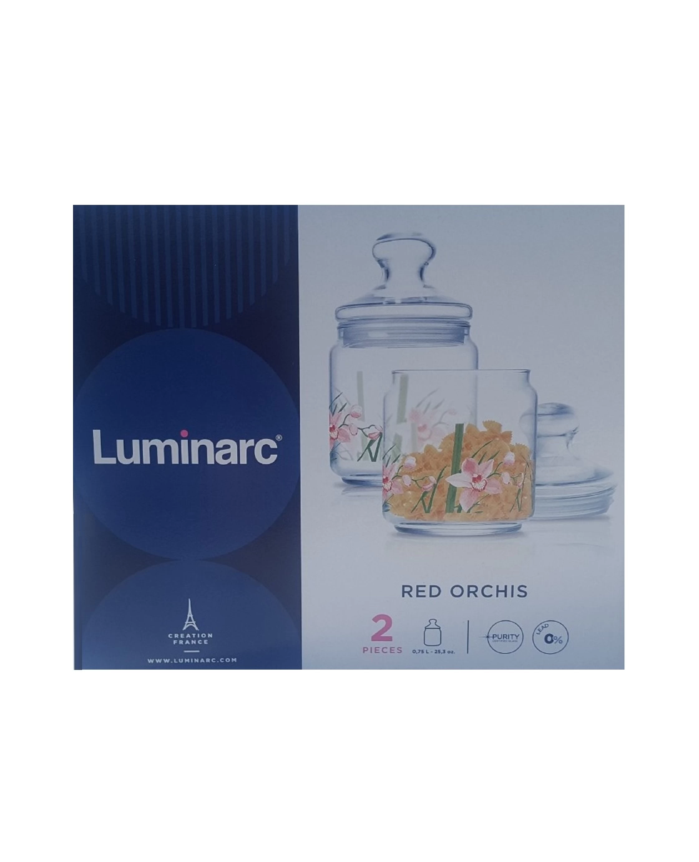Set de două borcane Luminarc Red Orchis cu capac, fiecare cu o capacitate de 0,75 litri.