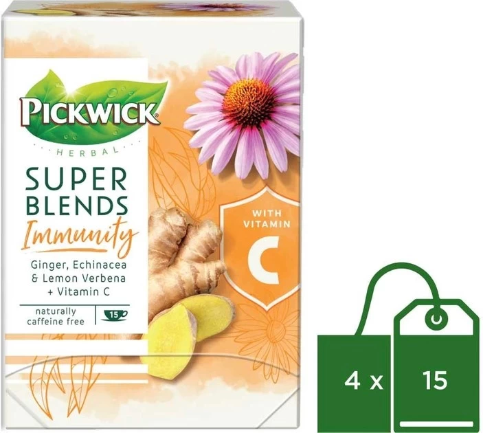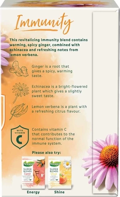 Ceaiul din plante Pickwick Super Blends Immunity este un amestec de ghimbir picant combinat cu echinacea și note răcoritoare de verbină de lămâie. Ceaiul este îmbogățit cu vitamina C pentru a vă susține imunitatea.