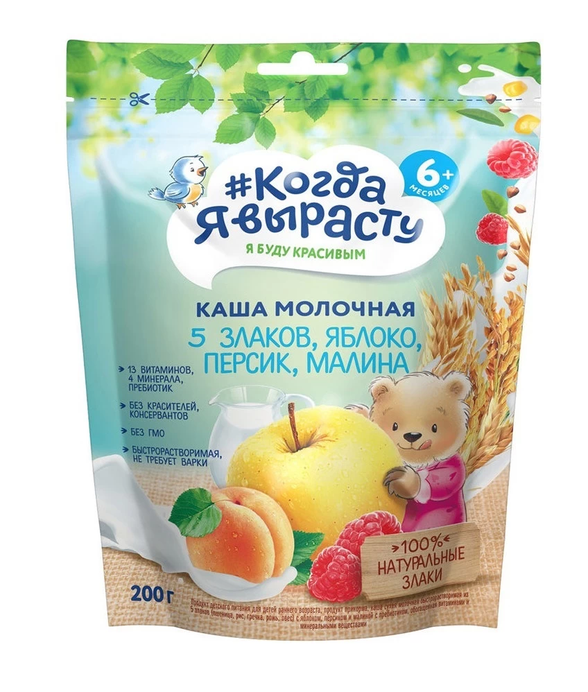 "Când o să fiu mare" Terci de lapte 5 cereale, mere, piersici și zmeură este o hrană echilibrată și sănătoasă pentru bebeluși, recomandată pentru bebelușii cu vârsta de peste 6 luni. Terciul este îmbogățit cu prebiotice pentru a îmbunătăți digestia, precum și cu vitamine și minerale, atât de importante pentru un bebeluș la această vârstă. Terciul este produs în cea mai nouă fabrică modernă, cu cerințe de înaltă calitate pentru hrana pentru bebeluși.