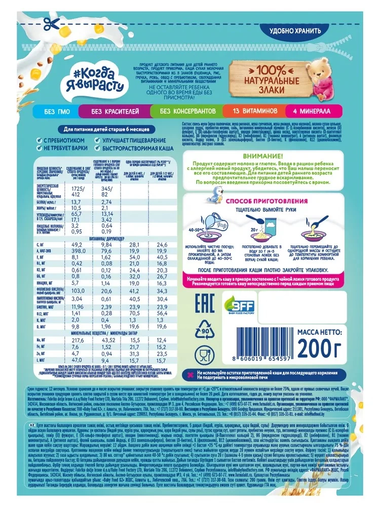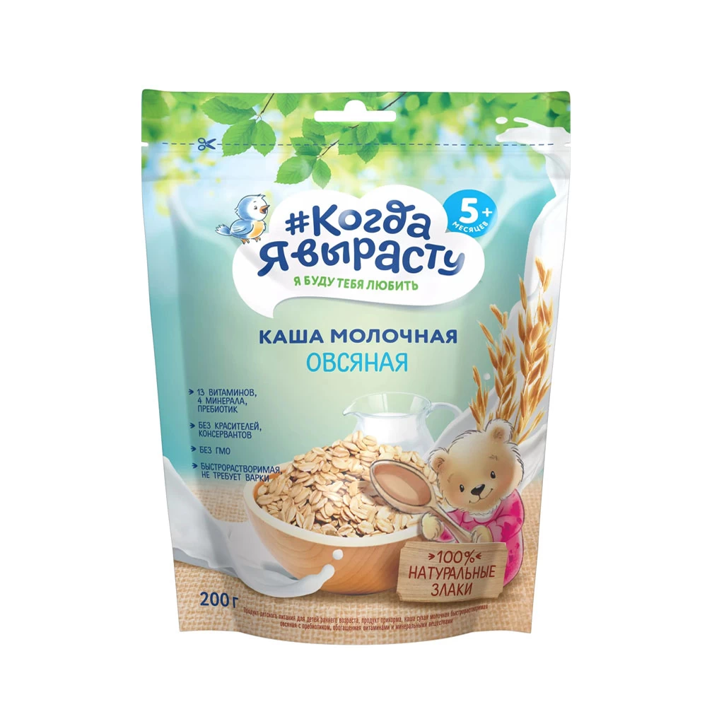 Terciul de ovăz cu lapte "Când voi fi mare" este un aliment echilibrat și sănătos pentru bebeluși, recomandat pentru bebelușii cu vârsta de peste 6 luni. Terciul este îmbogățit cu prebiotice pentru a îmbunătăți digestia, precum și cu vitamine și minerale esențiale pentru bebelușii de această vârstă. Terciul este produs în cea mai nouă fabrică modernă, cu cerințe înalte de calitate pentru hrana pentru bebeluși.