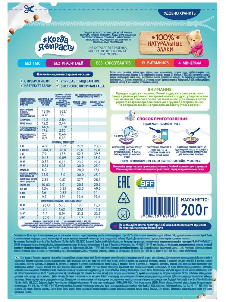 Ingrediente: Făină de hrișcă, lapte praf integral, piure de prune uscate, zahăr pudră, inulină prebiotică, sare, premix de vitamine și minerale (C (acid L-ascorbic), fumarat de fier (II), E (acetat de DL-alfa-tocoferol), niacină (nicotinamidă), oxid de zinc, acid pantotenic (D-pantotenat de calciu), B6 (clorhidrat de piridoxină), B2 (riboflavină), B1 (mononitrat de tiamină), A (acetat de retinol), acid folic, iodură de potasiu, D (D3 colecalciferol), biotină (D-biotină), K (filocaină), B12 (ziancobalamină).
