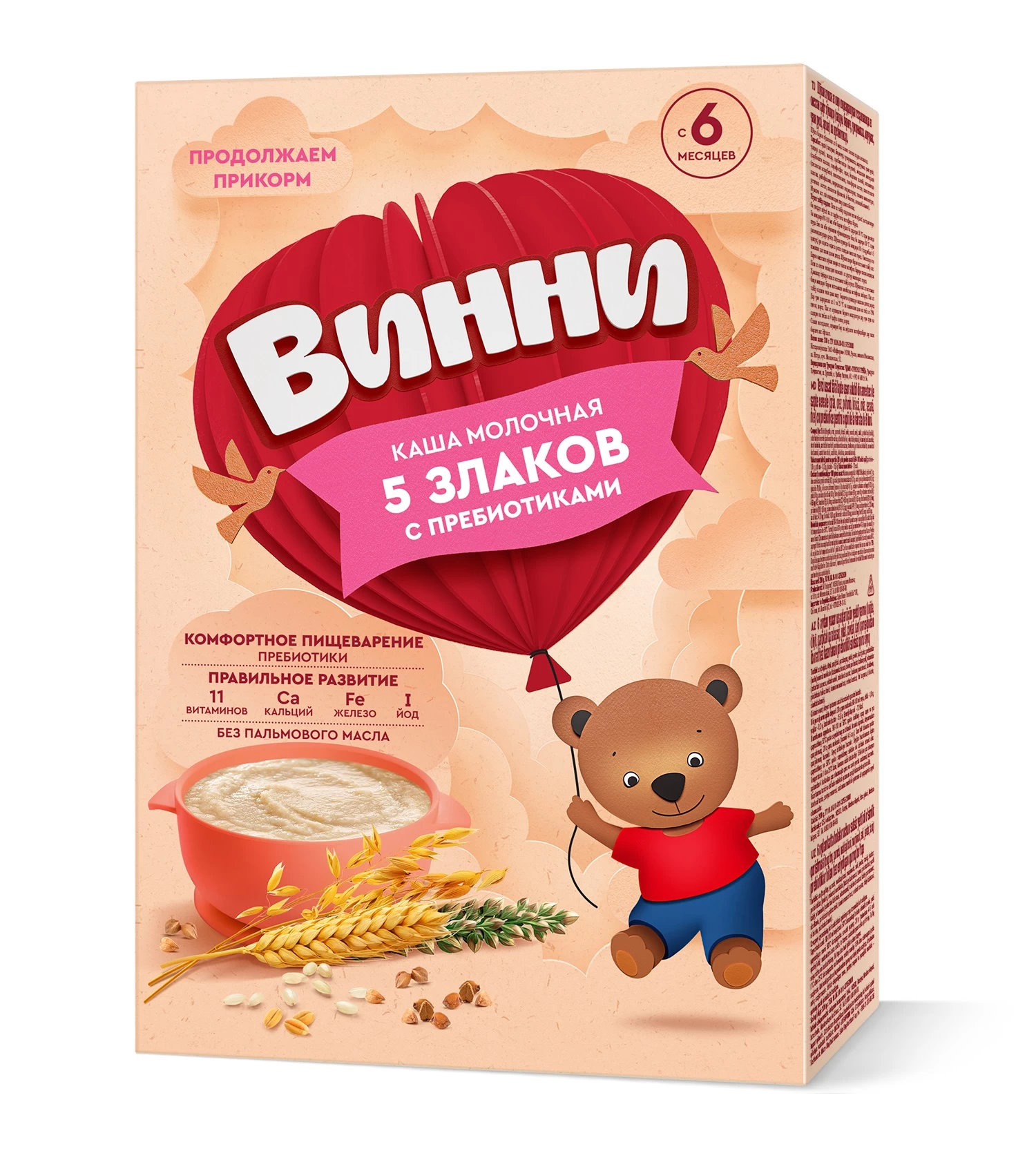 Pentru copiii de la 6 luni Cu prebiotice. Fără ulei de palmier. Porții din mai multe cereale sunt potrivite pentru extinderea dietei unui copil mai vechi de 6 luni. Cerealele de cereale de lapte 5 vor încărca copilul cu energie pentru întreaga zi, iar prebioticele vor ajuta la normalizarea microflorei intestinale. Compoziție echilibrată • fără adăugarea de palmieri și alte uleiuri vegetale