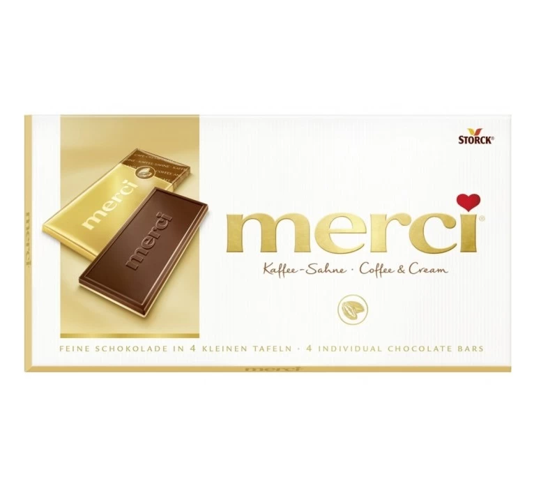 Tabletele de ciocolată Merci sunt ciocolată de cea mai înaltă calitate germană. Ambalajul original în plic conține patru tablete de ciocolată elegante, ambalate individual. Batoanele de ciocolată Merci sunt disponibile în șase arome: ciocolată cu lapte, ciocolată amăruie, alune și migdale, cafea și cremă, cremă de nuci, marțipan.