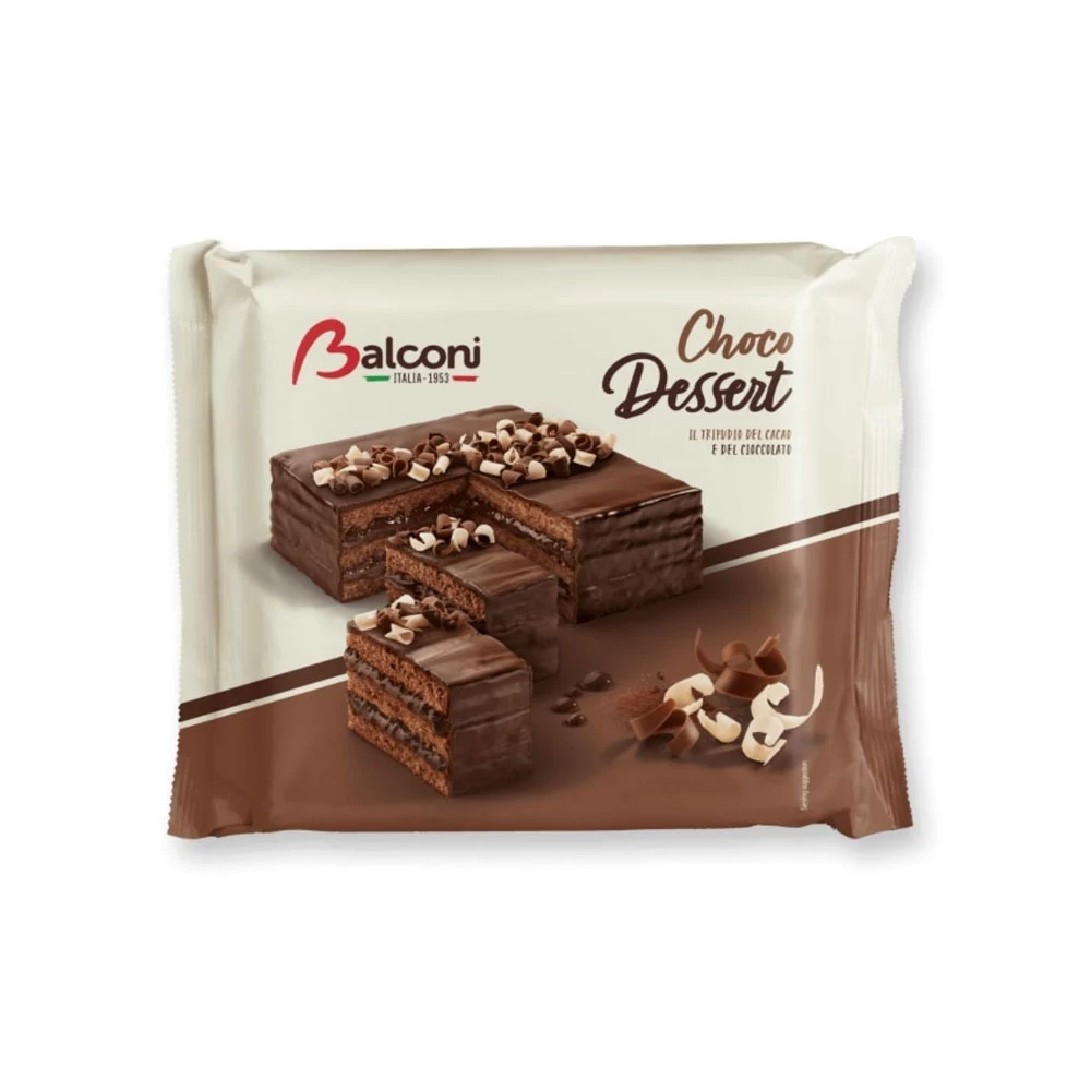 Balconi Choco Dessert este un desert rafinat, creat special pentru iubitorii gustului autentic de ciocolată. Acest desert este alcătuit din straturi fine de blat moale de cacao, completate de o cremă delicată și intens aromată de ciocolată, iar la exterior este acoperit cu o glazură crocantă de ciocolată care oferă un plus de savoare și textură.