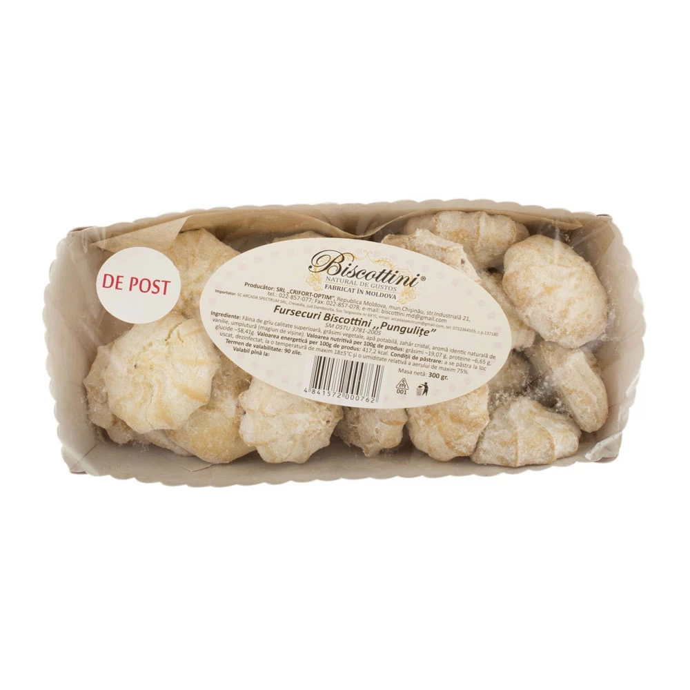 Fursecurile „Pungulițe” de la Biscottini sunt pregătite cu grijă după rețete tradiționale, fiind o gustare ideală pentru momentele în care îți dorești ceva dulce, dar și ușor. Textura fragedă, gustul fin și aspectul rustic fac ca aceste fursecuri să fie preferate de toată familia. Sunt potrivite și pentru perioadele de post. Fiecare punguliță ascunde aroma copilăriei, fiind presărată cu zahăr pudră pentru un plus de farmec.