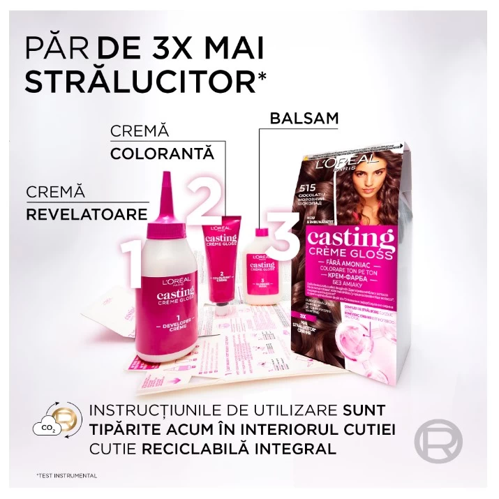 Casting Crème Gloss contine balsam imbogatit cu ulei de cocos. Asigura nuante bogate de saten si reflexe intense. Noua colectie COOL brunette: mixul perfect de reflexe reci, irizate si cenusii, care neutralizeaza tonurile calde/aramii, pentru o culoare cu aspect natural si o stralucire de exceptie. - crema coloranta fara amoniac pentru un miros placut; - culoare ultra-stralucitoare cu reflexe vizibile; - asigura acoperirea optima a firelor de par alb; - asigura hranire intensa pentru un par matasos si voluptos; - colorare ce dureaza pana la 28 de samponari.