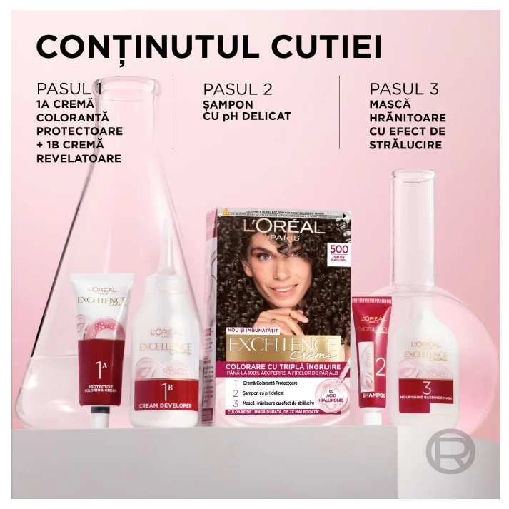Noul kit de colorare Excellence Creme oferă un rezultat de culoare îmbunătățit. Îmbogățit cu Acid Hialuronic, noul kit de colorare hidratează părul în timp ce îl colorează. Asigură, de asemenea, o livrare mai bună a culorii, pentru nuanțe care rezistă.