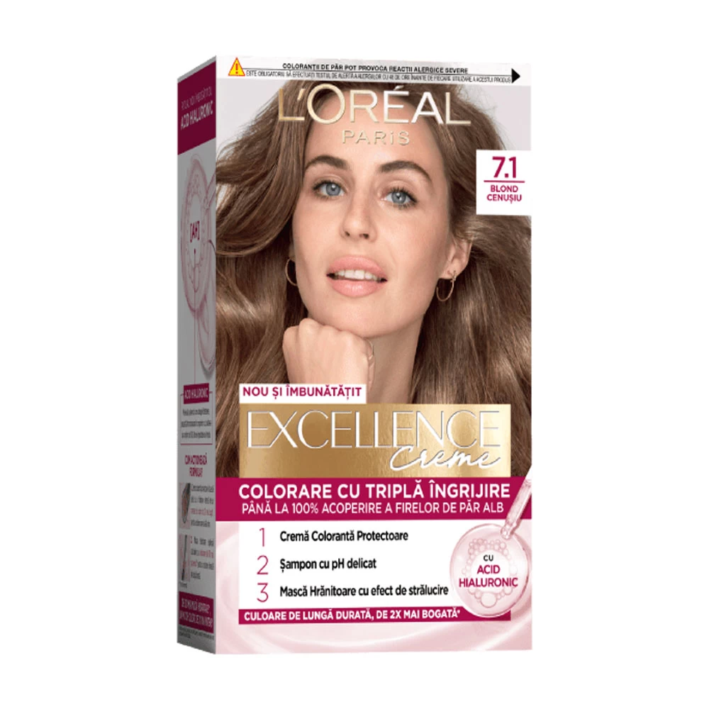 Vopsea de par permanenta cu amoniac L'Oreal Paris Excellence Creme 7.1 Blond Cenusiu, 192 ml