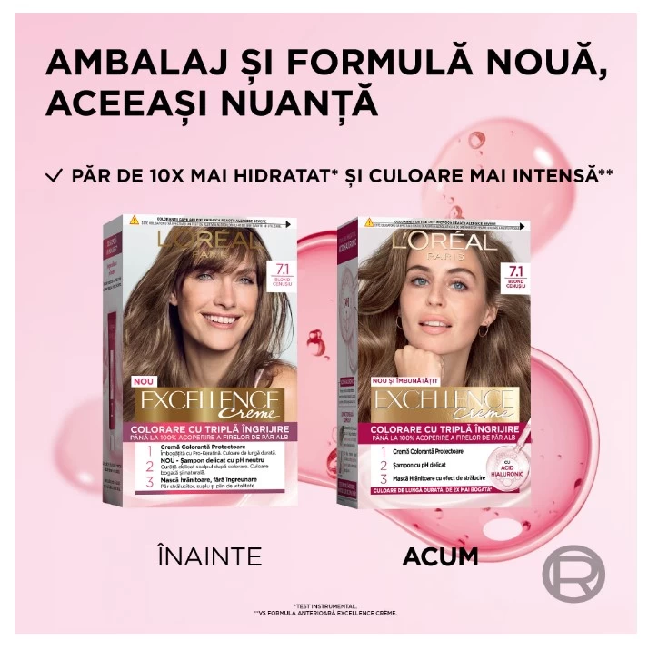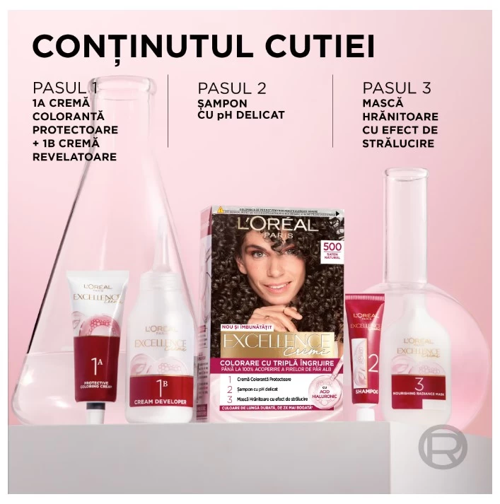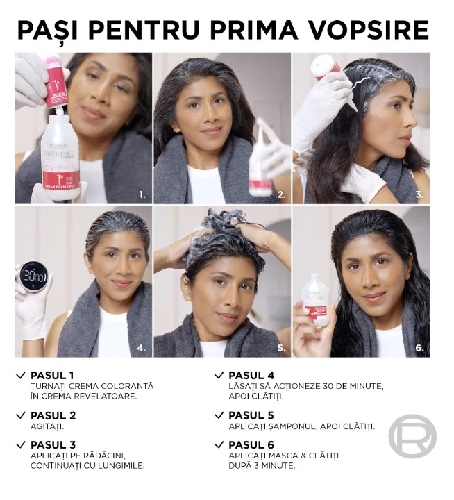 Varianta 2: Daca va colorati parul pentru prima data, sau daca parul tau nu a fost colorat in ultimele 3 luni, sau daca nuanta noua este foarte diferita. Incepeti aplicarea produsului la radacini, pe parul uscat, nespalat. Separati parul suvita cu suvita cu ajutorul flaconului aplicator. Repartizati restul produsului pe toata suprafata parului si lasati sa actioneze timp de 30 de minute. 2. CLATIRE SI CURATARE DELICATA UN NOU GEST - Sampon delicat dupa colorare cu dubla actiune. Formulat special pentru a fi folosit imediat dupa clatirea amestecului colorant Excellence. 1. Curata delicat scalpul si parul, indepartand reziduurile ramase in urma colorarii. 2. Netezeste parul pentru a-i dezvalui stralucirea. Culoare cu aspect natural. La inceput, umeziti parul cu putina apa si masati usor pentru a emulsiona amestecul colorant. Apoi clatiti din abundenta pana cand apa devine limpede. Acum puteti indeparta manusile. Desprindeti capacul samponului delicat cu dubla actiune si aplicati. Masati produsul pana ce spuma formata devine bogata si densa. Apoi clatiti. 3 APLICATI MASCA HRANITOARE FORMULA NOUA - Masca hranitoare, cu textura usoara. Hraneste parul intens saptamana dupa saptamana, fara a-l ingreuna. Aplicati o cantitate de marimea unei alune de padure din masca hranitoare, cu textura usoara. Lasati sa actioneze timp de 3 minute si apoi clatiti. Pastrati asca hranitoare, cu textura usoara pentru a o folosi o data pe saptamana pana la urmatoarea colorare, pentru un par matasos, stralucitor si plin de vitalitate