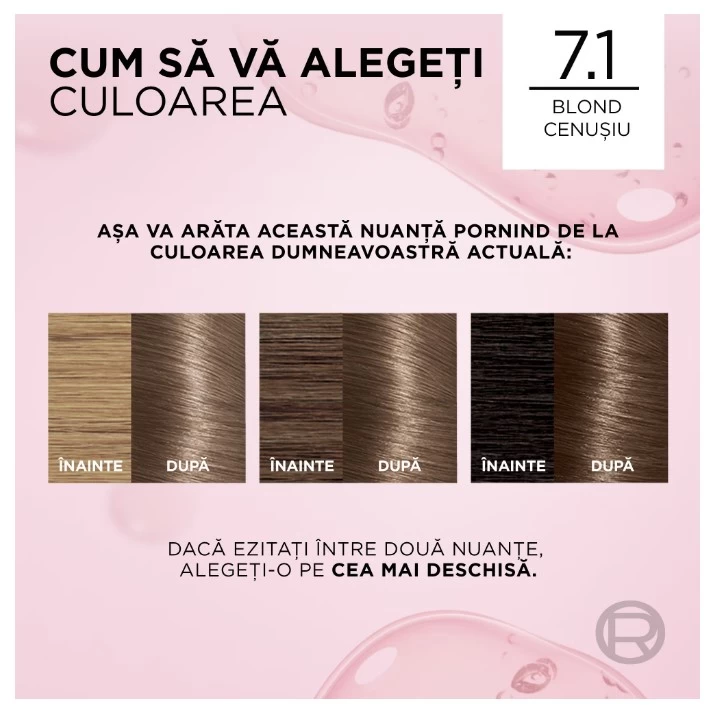 Recomandare: Acest produs este recomandat pentru toate tipurile de par. Este ideal pentru o acoperire de 100% a firelor albe de par. ATENTIE! Colorantii capilari pot provoca reactii alergice severe. Cititi si respectati instructiunile de utilizare. Acest produs nu este destinat pentru uzul persoanelor cu varsta sub 16 ani. Tatuajele temporare cu ""henna neagra"" pot creste riscul unei alergii. Nu va colorati parul daca: - aveti o eruptie pe fata sau aveti un scalp sensibil, iritat sau leziuni; - ati avut vreodata orice reactie dupa colorarea parului; - ati avut in trecut o reactiue la un tatuaj temporar cu "henna neagra";