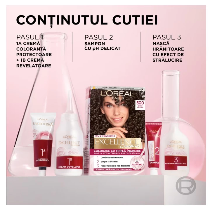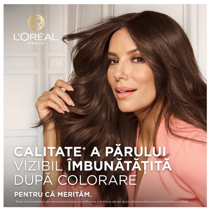 Varianta 2: Daca va colorati parul pentru prima data, sau daca parul tau nu a fost colorat in ultimele 3 luni, sau daca nuanta noua este foarte diferita. Incepeti aplicarea produsului la radacini, pe parul uscat, nespalat. Separati parul suvita cu suvita cu ajutorul flaconului aplicator. Repartizati restul produsului pe toata suprafata parului si lasati sa actioneze timp de 30 de minute. 2. CLATIRE SI CURATARE DELICATA UN NOU GEST - Sampon delicat dupa colorare cu dubla actiune. Formulat special pentru a fi folosit imediat dupa clatirea amestecului colorant Excellence. 1. Curata delicat scalpul si parul, indepartand reziduurile ramase in urma colorarii. 2. Netezeste parul pentru a-i dezvalui stralucirea. Culoare cu aspect natural. La inceput, umeziti parul cu putina apa si masati usor pentru a emulsiona amestecul colorant. Apoi clatiti din abundenta pana cand apa devine limpede. Acum puteti indeparta manusile. Desprindeti capacul samponului delicat cu dubla actiune si aplicati. Masati produsul pana ce spuma formata devine bogata si densa. Apoi clatiti. 3 APLICATI MASCA HRANITOARE FORMULA NOUA - Masca hranitoare, cu textura usoara. Hraneste parul intens saptamana dupa saptamana, fara a-l ingreuna. Aplicati o cantitate de marimea unei alune de padure din masca hranitoare, cu textura usoara. Lasati sa actioneze timp de 3 minute si apoi clatiti. Pastrati asca hranitoare, cu textura usoara pentru a o folosi o data pe saptamana pana la urmatoarea colorare, pentru un par matasos, stralucitor si plin de vitalitate