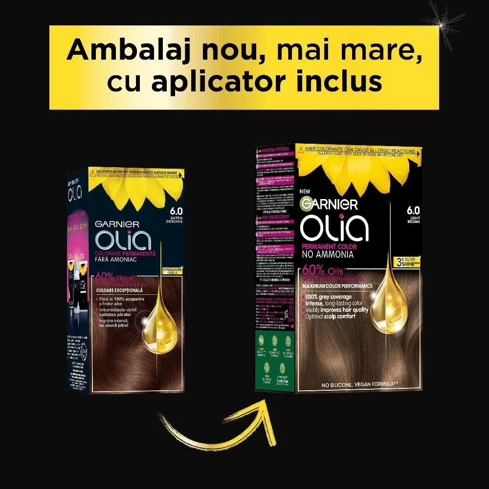 Vopsea de par permanenta fara amoniac Garnier Olia 6.0 Light Brown - Saten deschis, uniform si luminos, 174 ml