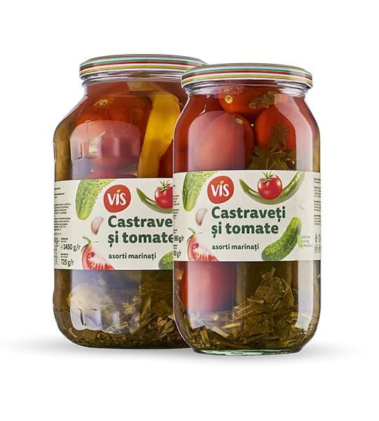 Castraveții și tomatele asortate VIS sunt alegerea perfectă pentru o masă gustoasă și echilibrată. Legumele sunt atent selectate, marinate într-o saramură aromată cu ierburi și condimente, păstrându-și textura crocantă și gustul autentic. Ideal de servit ca aperitiv, garnitură lângă carne, pește sau feluri principale, dar și ca ingredient pentru salate și platouri reci. Produsul este gata de consum și nu necesită preparare suplimentară.