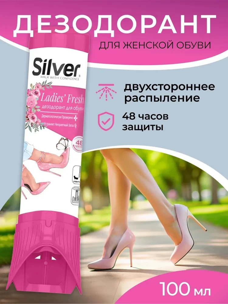 Mirosul neplăcut al pantofilor este o problemă delicată și neplăcută care vă poate strica ziua. Motivul constă în transpirația crescută a picioarelor. Pentru persoanele cu această problemă, specialiștii de la Silver TM au dezvoltat un deodorant special pentru pantofi, care vă va face să vă simțiți mai confortabil. Produsul este universal, compatibil cu pantofii din orice material. Nu lasă pete și dungi. Pentru a păstra calitățile produsului, acesta trebuie protejat de lumina directă a soarelui și depozitat la o temperatură și umiditate optime.