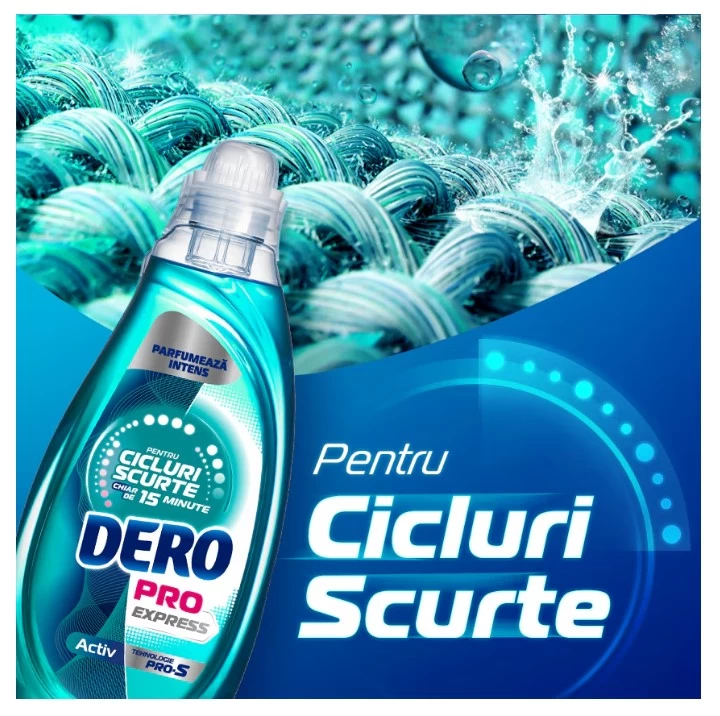 Dero Pro Express Activ este un detergent lichid pentru cicluri scurte, chiar si de 15 minute. Detergentul lichid Dero Pro Express Activ parfumeaza intens si lasa hainele curate si improspatate.