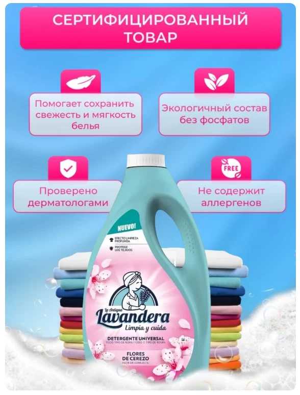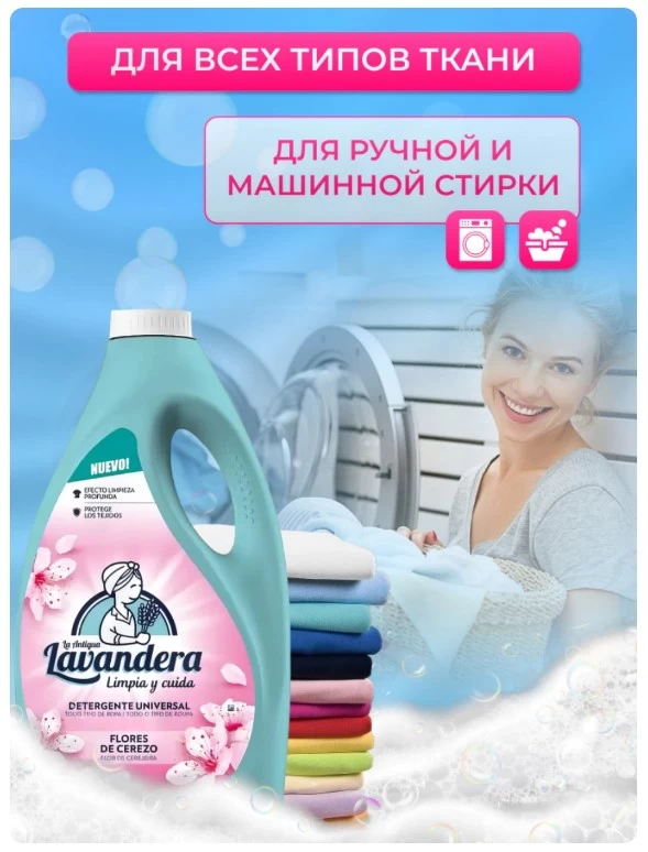 Detergentul Lavandera Floral de la producătorul spaniol spală delicat hainele, păstrează culoarea și îndepărtează diferite tipuri de murdărie.
