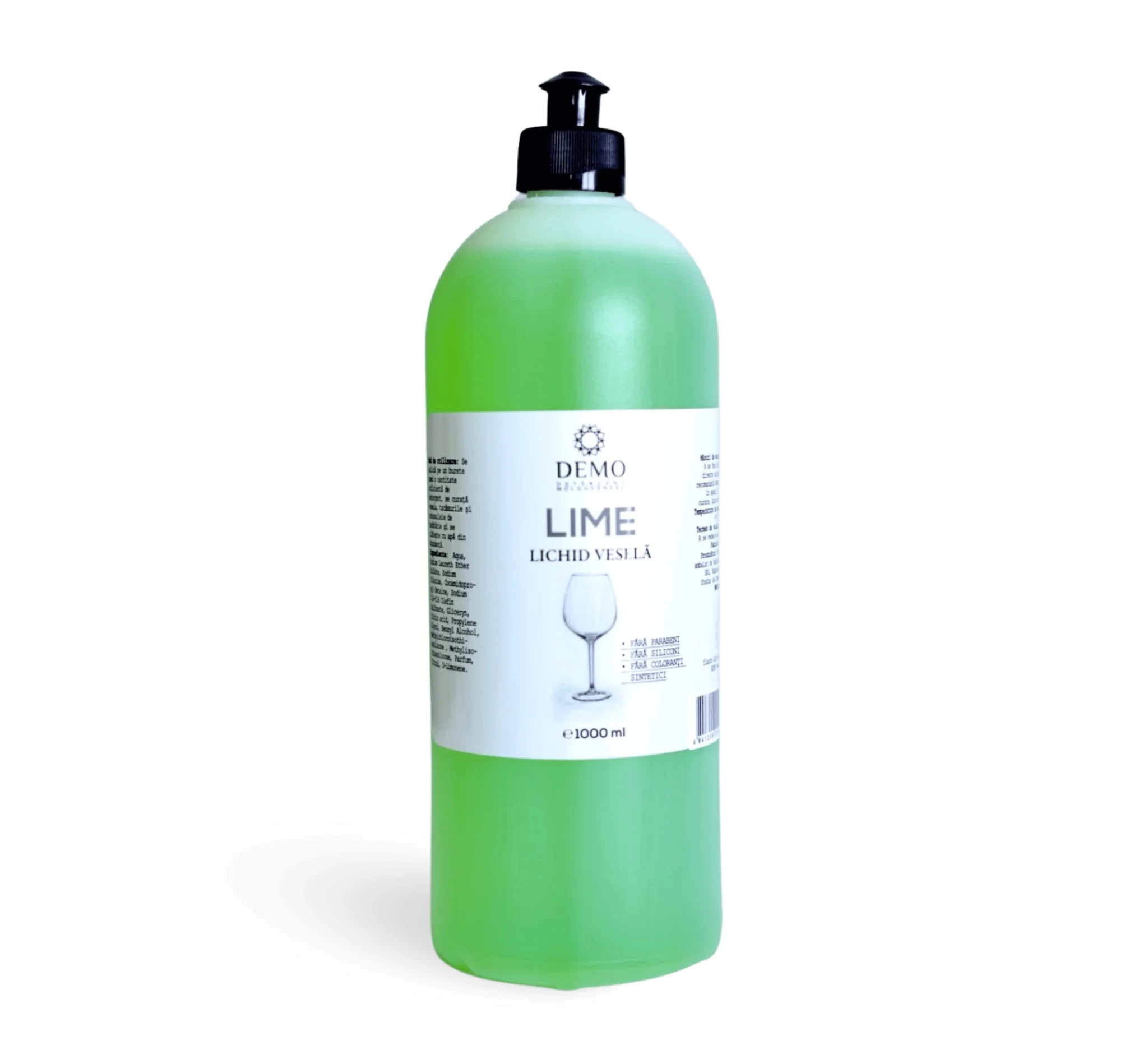 Detergent pentru vase “Demo” lime. Curata si indeparteaza urmele de grasime si murdarie de pe suprafetele veselei si a ustensilelor de bucatarii. Dizolva depunerile alimentare: proteine, grasimi, arsuri. Are un pH neutru, apropiat de pH-ul pielii, sigur pentru spalarea manuala a vaselor.