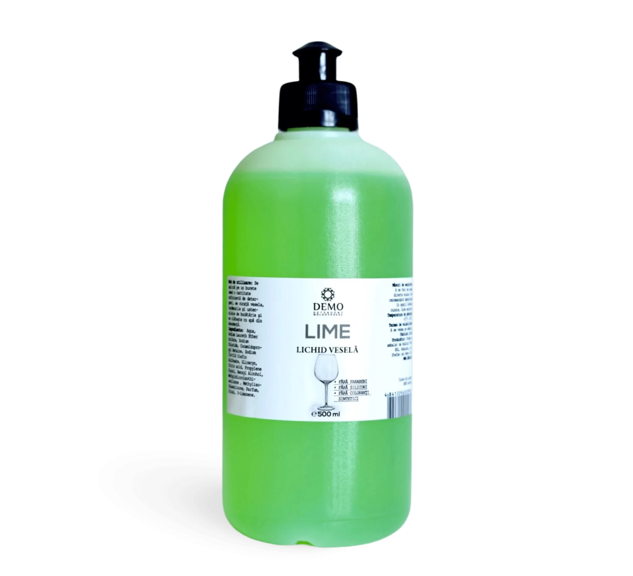 Detergent pentru vase “Demo” lime. Curata si indeparteaza urmele de grasime si murdarie de pe suprafetele veselei si a ustensilelor de bucatarii. Dizolva depunerile alimentare: proteine, grasimi, arsuri. Are un pH neutru, apropiat de pH-ul pielii, sigur pentru spalarea manuala a vaselor.