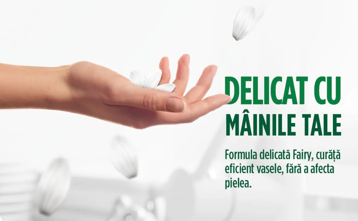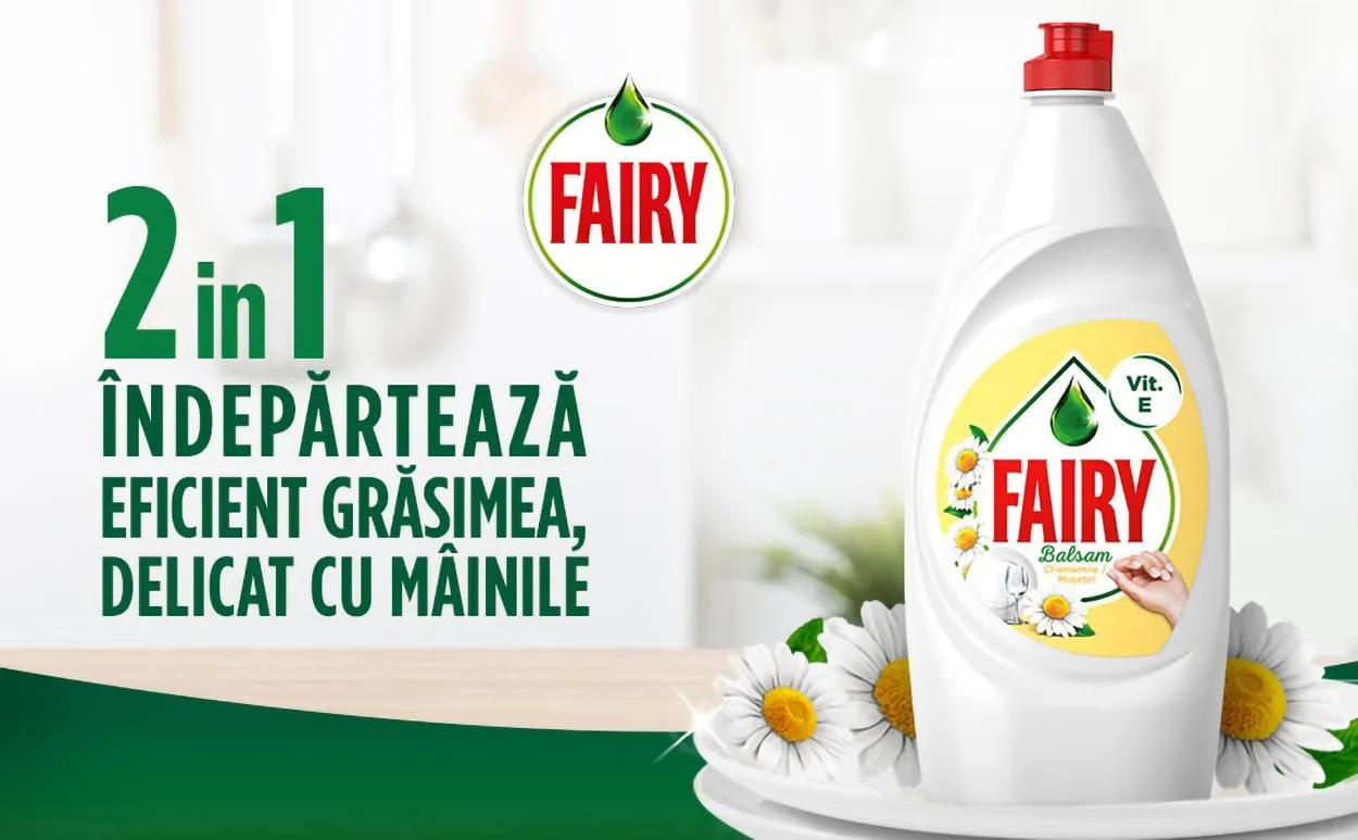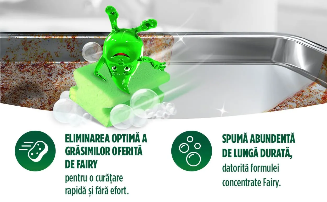 Fara murdarie. Fara grasime. Fara efort. Fairy ofera puterea de curatare pe care va puteti baza oricand la spalatul vaselor. Dureaza de 3X mai mult decat v-ati astepta. De la vase la pahare, cratite si tigai, formula puternica a Fairy elimina cu usurinta grasimea, indiferent de provocare. Disponibil intr-o gama larga de parfumuri, precum Lamaie, Mar si Rodie, in cantitati diferite. Spuma abundenta Cu fiecare pictura veti obtine mai multa spuma de lunga durata, ceea ce inseamna mai multa putere de curatare. Putere incredibila de curatare a grasimilor Folosins tehnologia Lift Action, formula sa concentrata indeparteaza grasimea cu usurinta, lasand in urma sa vase incredibil de stralucitoare. Putere surprizatoare Dureaza de 3X mai mult decat va asteptati, astfel incat sa puteti spala mai multe vase cu aceeasi cantitate de lichid. Aroma placuta Detergentul de spalat vase Fairy nu numai ca face vasele stralucitoare, dar au si miros curat si proaspat. Va veti bucura de mirosurile placute produse in jurul chiuvetei din bucatarie in timp ce spalati.
