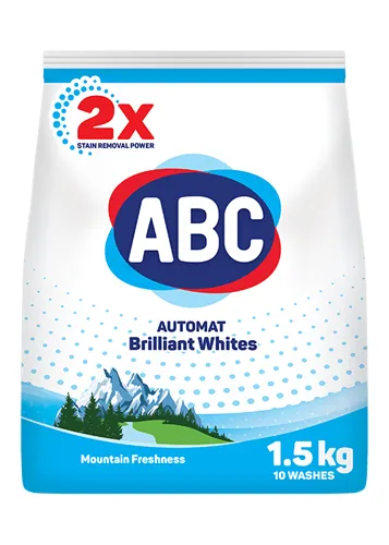 ABC Automat Mountain Freshness. Albușurile noastre preferate sunt și mai albe datorită noii formule și tehnologiei multi-enzimatice ABC Automat. ABC Automat Bright White a fost dezvoltat special pentru rufe mai albe și mai imaculate. ABC Automat Bright White oferă o strălucire strălucitoare și o albeață perfectă datorită enzimelor speciale și agenților de strălucire și îndepărtează cu ușurință petele încăpățânate și încăpățânate. Noul ABC Automat Bright White umple spălătoria cu o briză proaspătă de munte datorită parfumului său unic "Mountain Fresh".