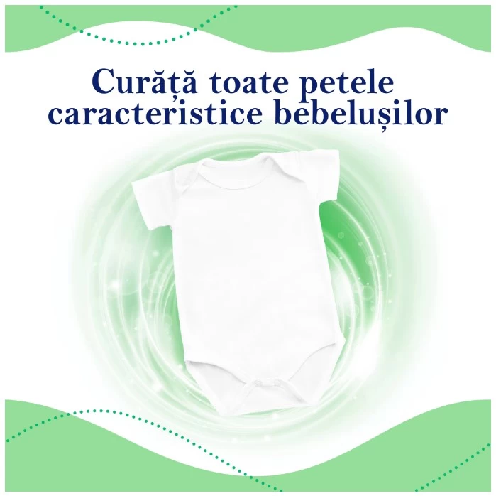 Este special creat pentru spalarea hainelor copiilor si bebelusilor, cu nimic mai mult de cat ingrediente esentiale.Este potrivit pentru uz inca din prima zi a copilului.Este testat clinic, hipoalergenic si nu contine fosfati.