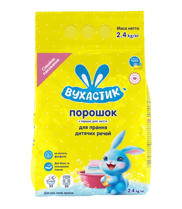 Detergent de rufe cu conținut scăzut de spumă, conceput pentru spălarea articolelor pentru copii, inclusiv pentru nou-născuți, din bumbac, in, țesături sintetice, precum și țesături din fibre mixte (cu excepția mătăsii naturale și a lânii) în mașini de spălat automate, mașini de tip activator și spălare manuală.