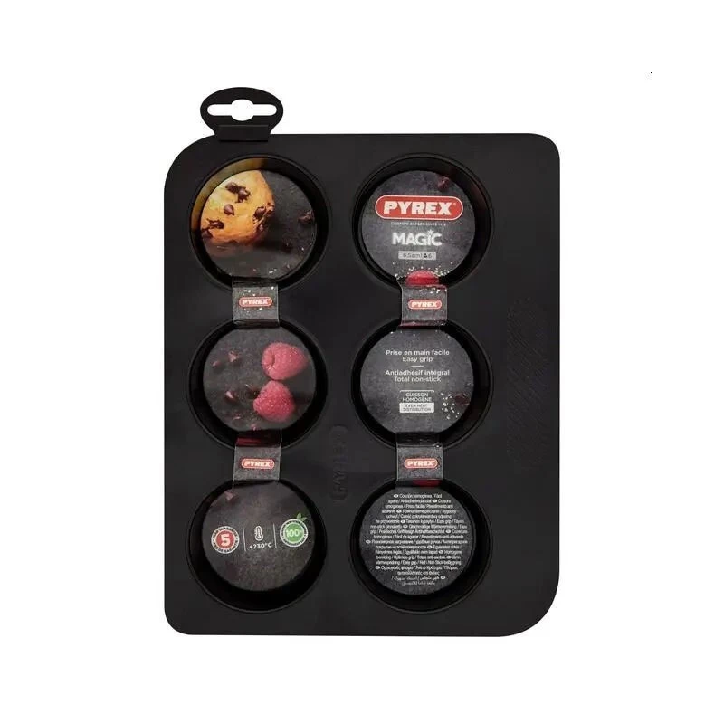 Forma metalică pentru brioșe Pyrex Magic din 6 piese este fabricată din oțel carbon, distribuie căldura în mod uniform și este rezistentă la deformare atunci când este încălzită. Acoperire antiaderentă rezistentă și sigură atât în interior, cât și în exterior, pentru o curățare ușoară.