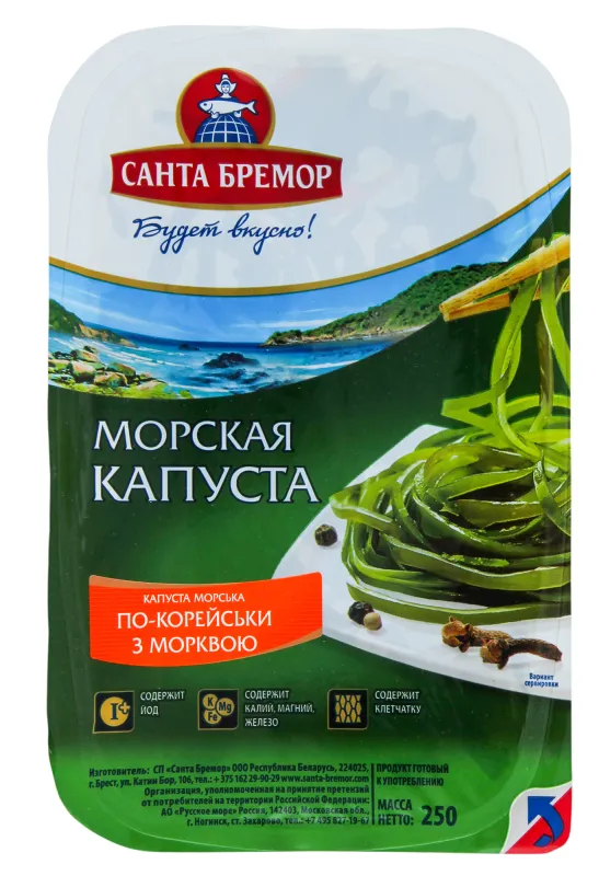 "Algele marine murate" este un produs perfect echilibrat, cu aromă clasică, care conține alge marine kelp brune - un complex natural format din numeroase vitamine și aproximativ 40 de micro și macronutrienți (iod, brom, mangan, cobalt, zinc, magneziu, fier, potasiu și altele). Conținut caloric scăzut, multe vitamine și minerale, iod natural - toate acestea fac ca algele marine de la "Santa Bremore" să fie deosebit de populare printre fanii alimentației sănătoase.
