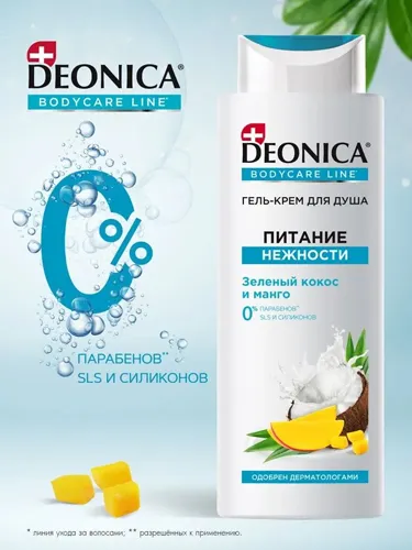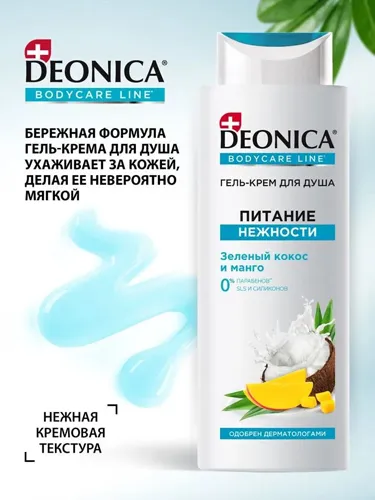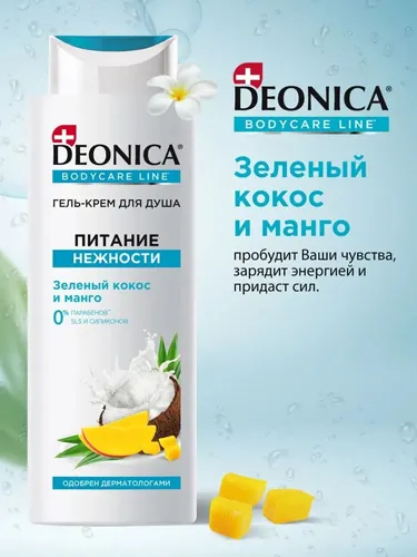 Formula delicată a gelului de duș cremă Deonica Nourishing Tenderness Shower Gel Cream are grijă de pielea ta, lăsând-o incredibil de moale. Parfumul proaspăt de nucă de cocos verde și mango vă va trezi simțurile, vă va energiza și vă va da energie.