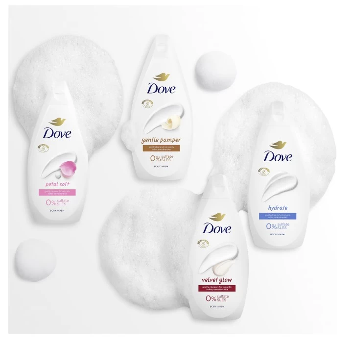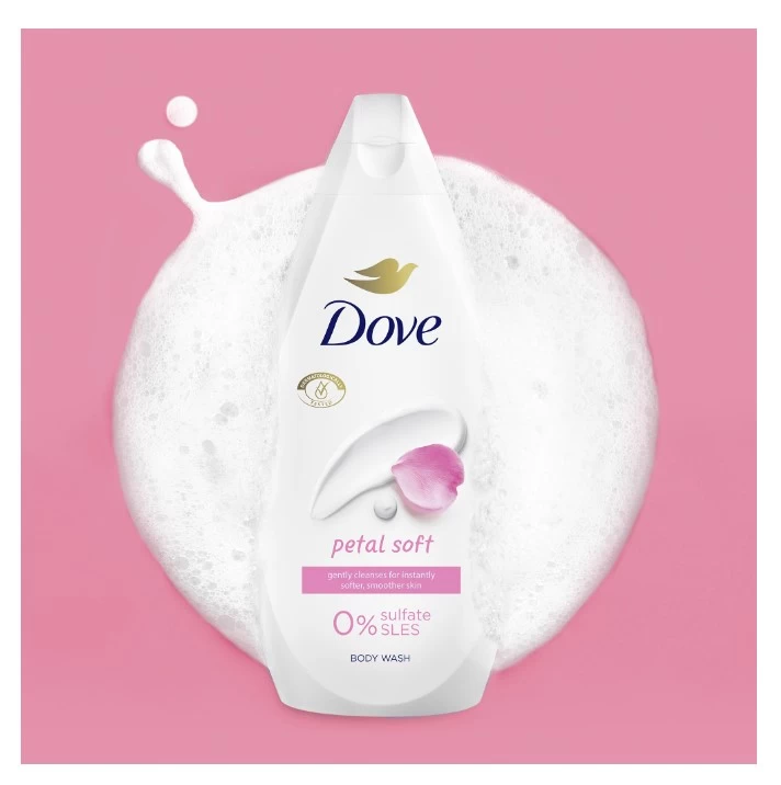 • Gelul de dus Dove Petal Soft cu 0% sulfati SLES curata delicat pielea fara a-i afecta nivelul natural de hidratare si o lasa fina si catifelata chiar de la primul dus.
