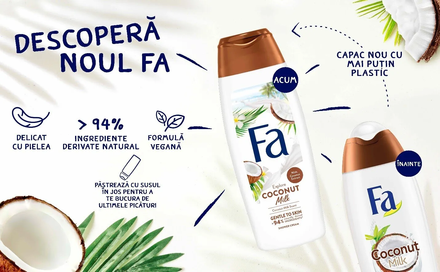Exploreaza crema de dus Fa Coconut Milk si bucura-te de rasfatul pur al laptelui de nuca de cocos care te ingrijeste si-ti lasa pielea matasoasa. Imbogatit cu extract natural de nuca de cocos care te va transporta cat ai clipi spre o calatorie tropicala.