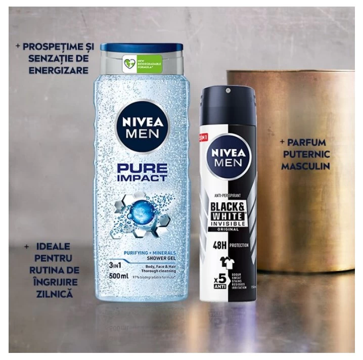 Hidratare intensiva si curatare in profunzime: Gel de dus NIVEA MEN Pure Impact. Formula inovatoare cu particule fine, exfoliante, pentru o curatare eficienta, ofera pielii tale prospetime de durata. Lasa pielea revitalizata si ingrijita.