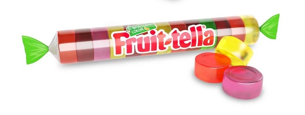 Marmeladă de mestecat Fruit-tella umplută cu arome de mere, piersici și zmeură.