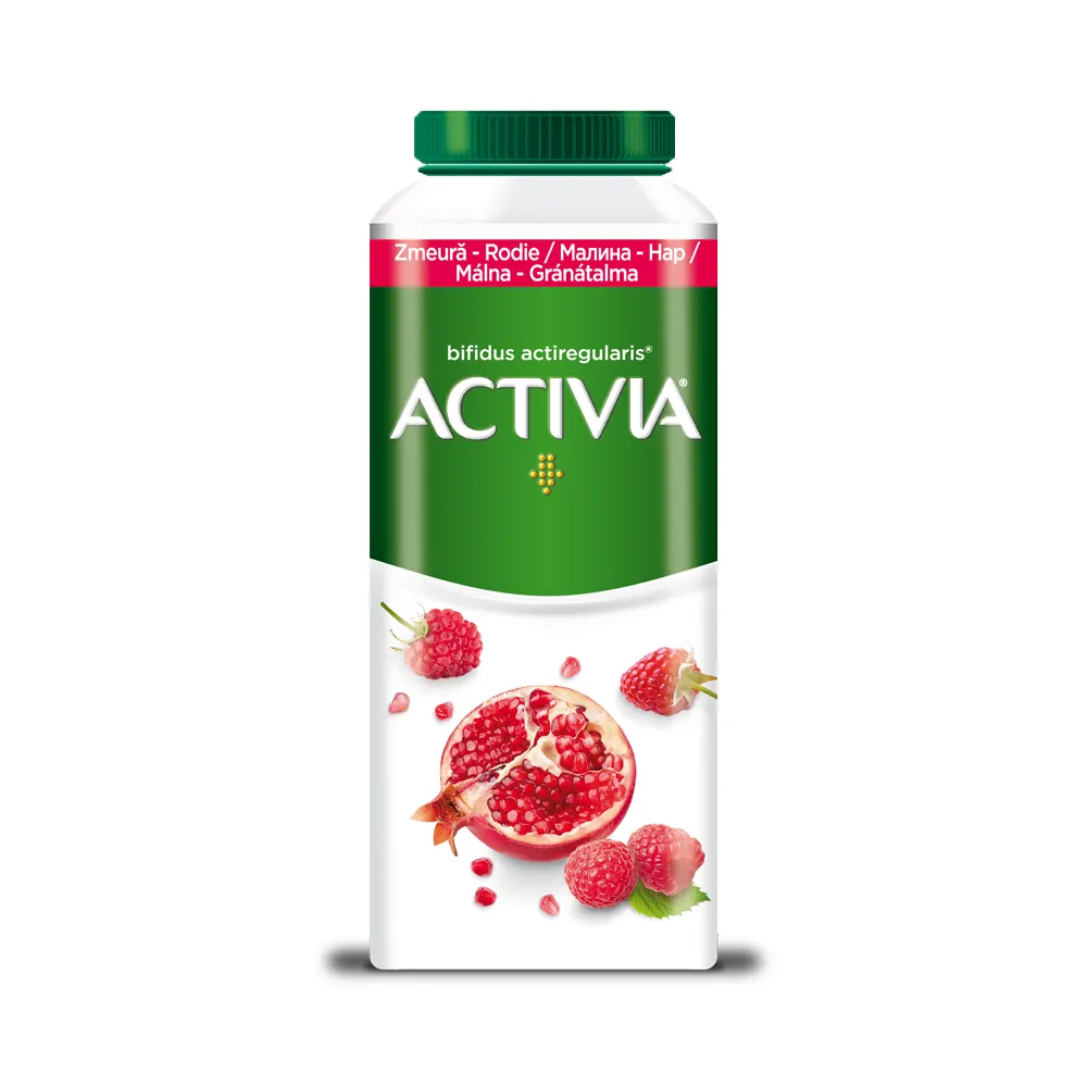Încearcă iaurtul de băut Activia cu zmeură și rodie, fără aditivi sau coloranți, cu miliarde de fermenți Bifidus Actiregularis care ajută digestia.