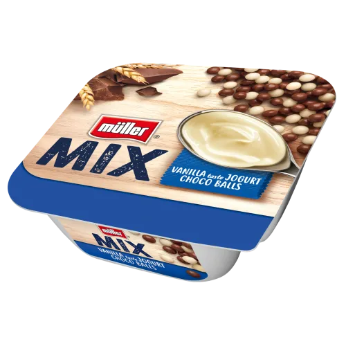 Sortimentul Muller Mix de iaurt cremos cu vanilie combinat cu bilute de cereale glazurate cu ciocolata este Mix-ul cu cei mai multi fani, atat printre adulti, cat si printre copii, fiind apreciat pentru gustul excelent si textura cremos-crocanta.