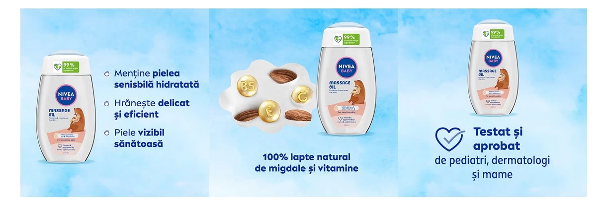 Toate produsele din gama noastra NIVEA pentru bebelusi sunt realizate cu lapte de migdale 100% natural si vitamine pentru calmarea si ingrijirea pielii bebelusului;