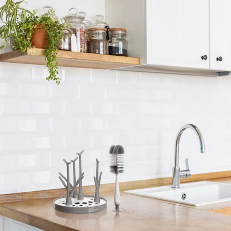 Peria va ajuta la curățarea temeinică atât a biberonului, cât și a tetinei. Peria autonomă este dotată cu o ventuză, permițându-vă să o atașați la orice suprafață plană pentru o uscare ușoară.