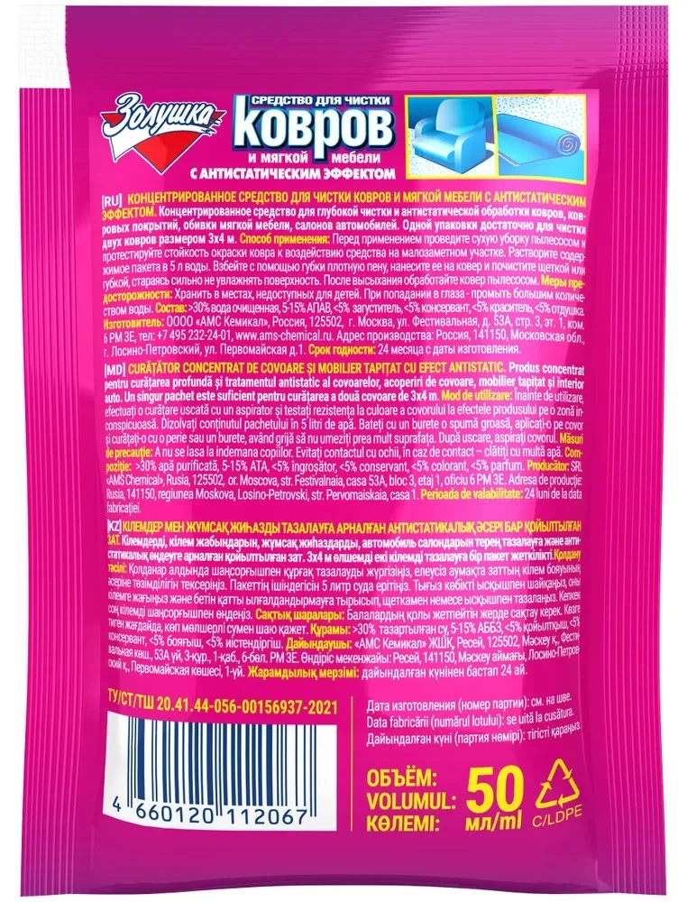 Produs concentrat pentru curățarea covoarelor, mochetelor și tapițeriilor. Un pachet de produs este suficient pentru a curăța două covoare de 3×4 m. Înainte de utilizare, verificați rezistența culorii covorului la produs într-un loc puțin vizibil.