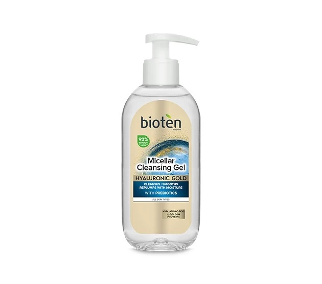 Gelul demachiant Bioten Hyaluronic Gold conține acid hialuronic, proteine aurii și probiotice, care îndepărtează eficient impuritățile, lăsând pielea netedă și hidratată.