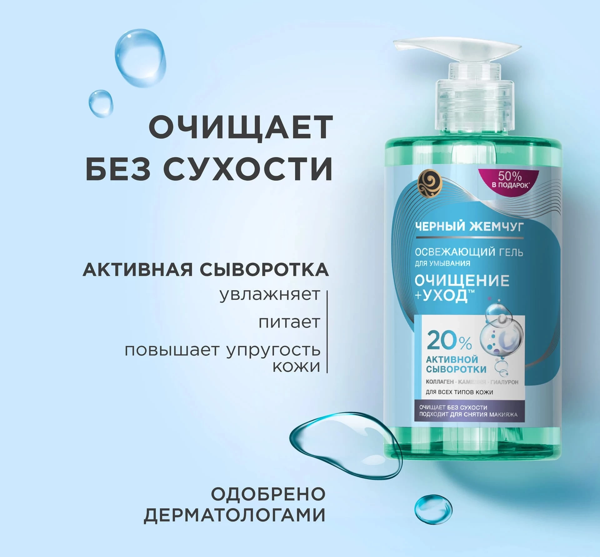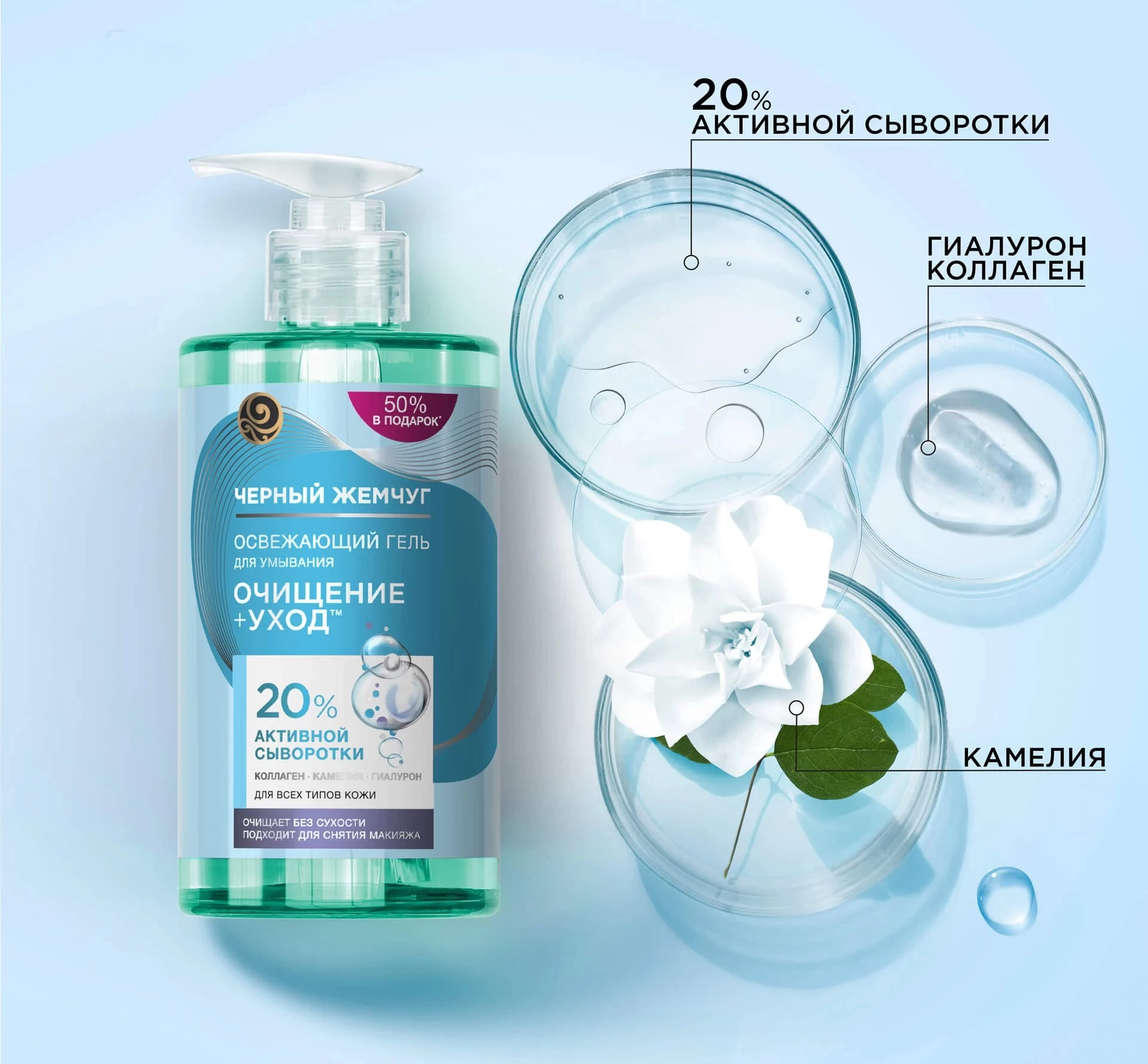 Gelul de curățare Black Pearl a fost creat pe baza noului* standard Curățare + Îngrijire. Formula specială cu 20% ser activ este destinată tuturor tipurilor de piele. Produsul cu textură delicată și aromă proaspătă curăță delicat fața și este potrivit pentru utilizare zilnică.