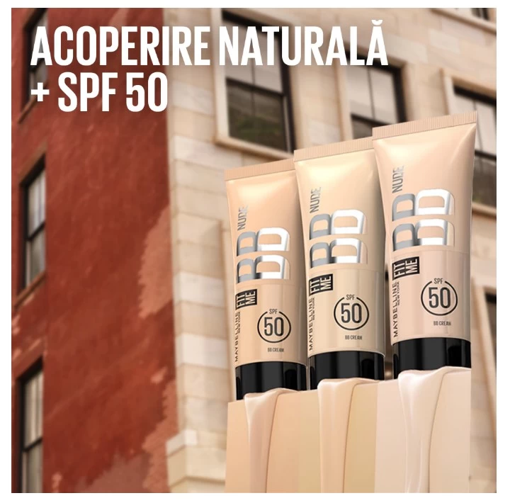 Fit me BB Cream de la Maybelline: acoperire lejera, hidratare si SPF 50 pentru un look natural impecabil, zilnic. Descopera nuanta ta perfecta!